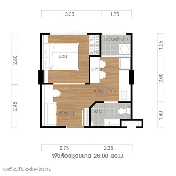 ฟังก์ชั่นการจัดวาง Layout ของห้องขนาด 26.00 ตร.ม. เหมือนกันกับห้องขนาด 22.50 ตร.ม. แต่ว่าห้องนี้จะมีความลึกของห้องมากกว่า โดยมี หน้ากว้าง 5.10 เมตร ลึก 5.20 เมตร โดยห้องนี้เป็นห้องที่ตกแต่งให้ดูเป็นตัวอย่างเท่านั้นนะคะ
