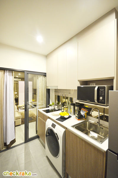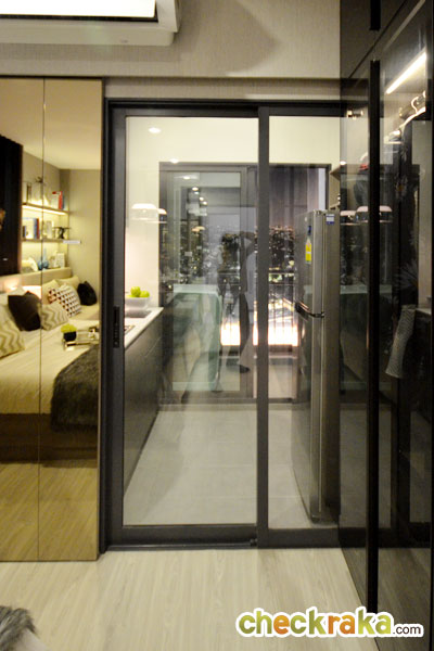 ครัวห้องนี้เป็นแบบครัวปิด ประตูครัวแบบบานสไลด์เช่นกัน แต่ไม่ได้ที่บังรางม่านนะคะ