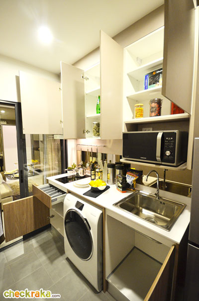 เปิดตู้และลิ้นชักออกมาหน้าตาประมาณนี้ ส่วนเครื่องซักผ้าจะตั้งอยู่ใต้เคาน์เตอร์ครัวแบบนี้ค่ะ