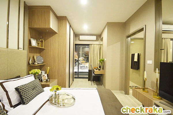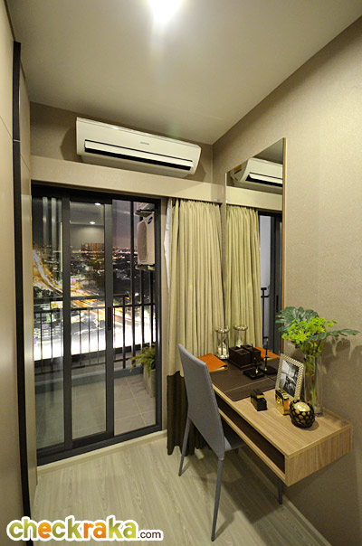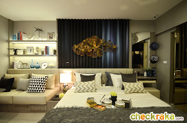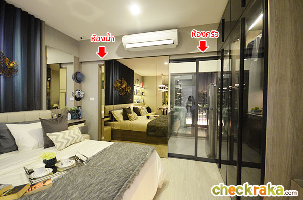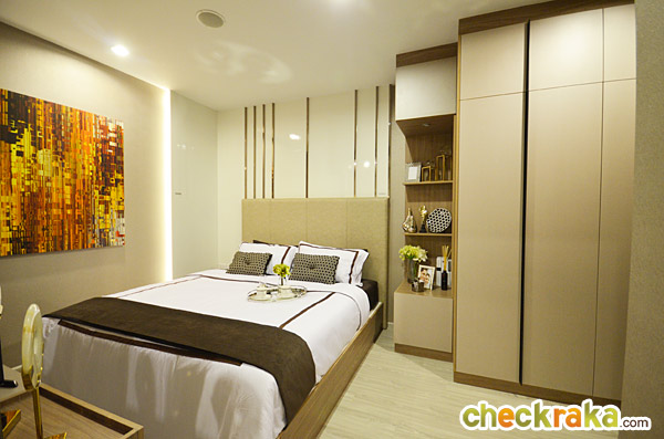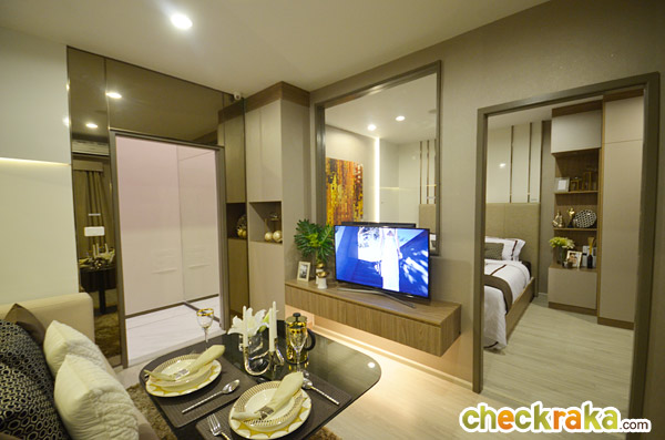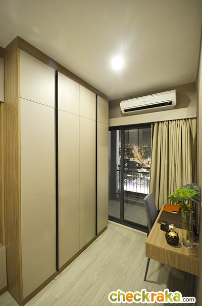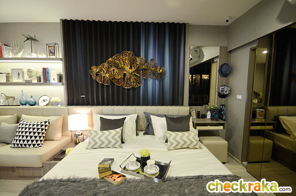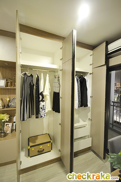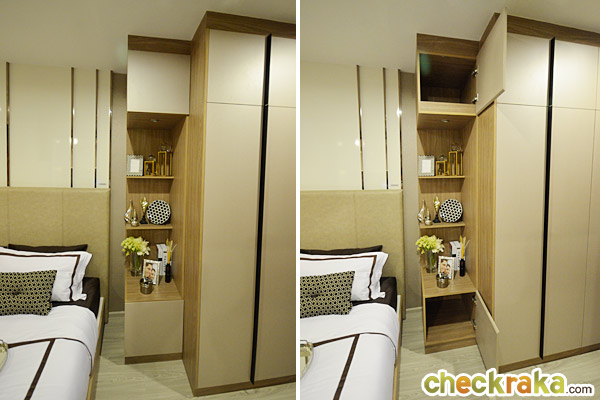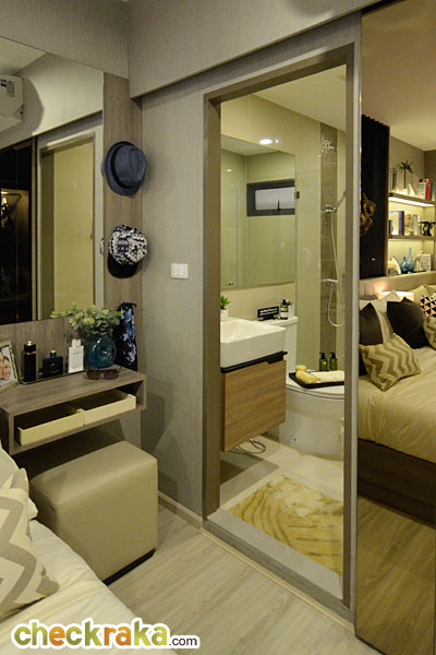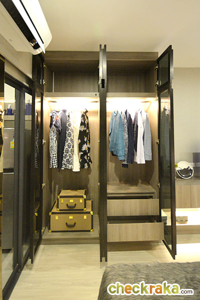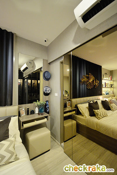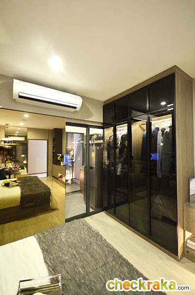 ในห้องตัวอย่างนี้ทางโครงการดีไซน์เป็นประตูกระจกเงาแบบบานสไลด์เพิ่มขึ้นมาเพื่อเพิ่มความรู้สึกให้ห้องดูกว้างมากขึ้น