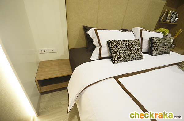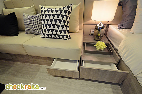 ข้างเตียงเป็น Built-in เป็นโต๊ะหัวเตียงขนาดเล็กมาให้ พร้อมต่อปลั๊กสำหรับใช้งานมาให้ด้วย