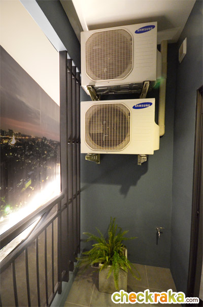 คอมเพรสเซอร์แขวนด้านบนเหนือเครื่องซักผ้า และมีโคมไฟกิ่งติดผนังอลูมิเนียมสีดำทรงสี่เหลี่ยมมาให้ 1 ดวง