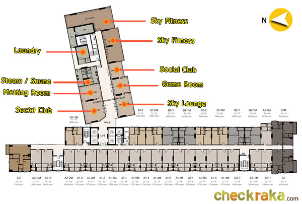 โดยโครงการนี้ จัดวางตำแหน่งของห้องแต่ละขนาดแยกออกจากกันได้ค่อนข้างชัดเจน ดังนี้ ทิศตะวันตก และทิศเหนือเกือบทั้งหมด จะเป็น ห้องแบบ Studio ขนาด 27.50 ตร.ม. - 28.00 ตร.ม. ทิศตะวันออก และทางฝั่งทิศใต้ เป็นห้องแบบ 1 ห้องนอน ขนาด 34.50 ตร.ม. ทิศเหนือ จะเป็นห้องนอนใหญ่แบบ 2 ห้องนอนขนาด 71.00 ตร.ม. และทิศใต้อีกบางส่วนจะเป็นแบบ 2 ห้องนอนขนาด 63.00 ตร.ม. ซึ่งจะตั้งอยู่ที่หัวมุมของอาคาร โดยแต่ละชั้นจะมีห้องแบบ 2 ห้องนอนเพียง 3 ห้องเท่านั้น ชั้น 21 :