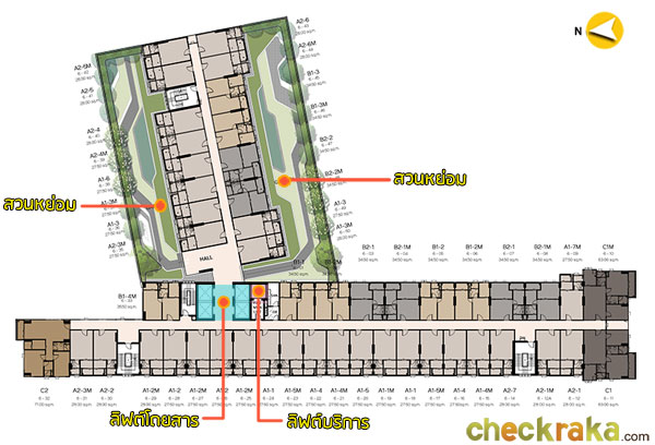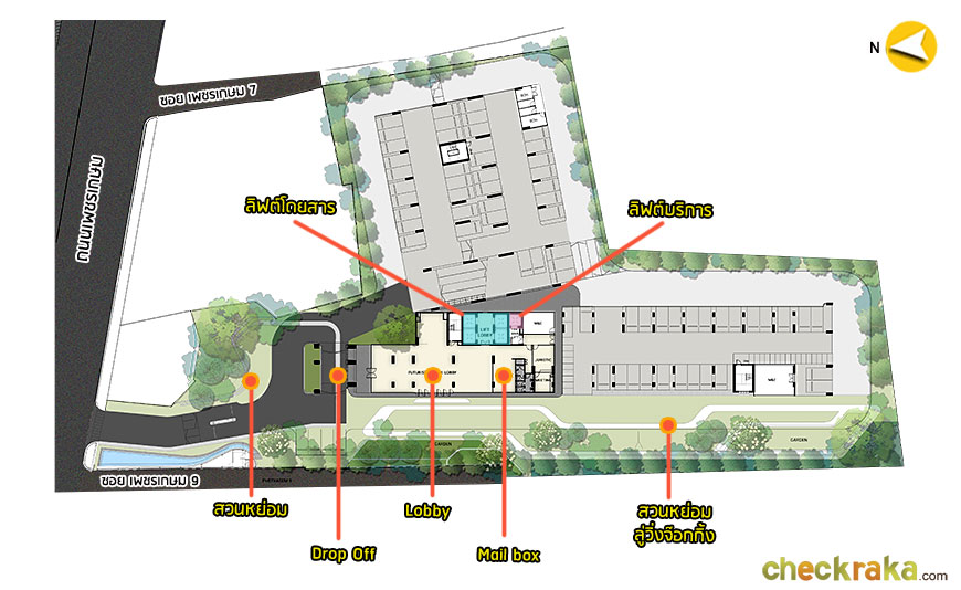 ชั้น 1 : ชั้นนี้เป็นส่วนของสวนหย่อม, ลู่สำหรับวิ่งจ๊อกกิ้ง, จุด Drop Off, Lobby, ห้องจดหมาย,