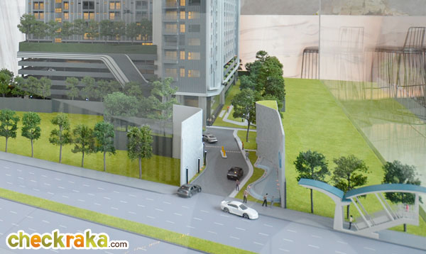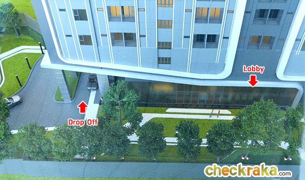 จากทางเข้าโครงการขับเข้ามาจะเจอกับจุด Drop Off ซึ่งอยู่ด้านหน้าประตูทางเข้าส่วนของ Lobby