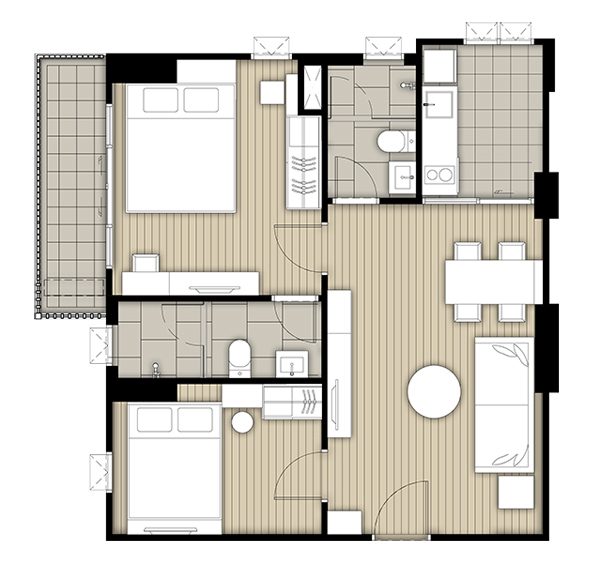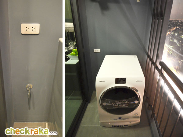 จุดนี้จะเป็นระเบียงสำหรับซักล้าง วางเครื่องซักผ้า ต่อท่อน้ำดีน้ำทิ้ง และก๊อกน้ำมาให้พร้อม