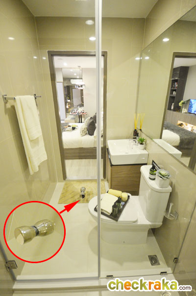 กั้นแบ่งโซนเปียกโซนแห้งด้วยฉากกั้นอาบน้ำกระจกเทมเปอร์ พร้อมธรณียกสูงอีกประมาณ 5 ซม.