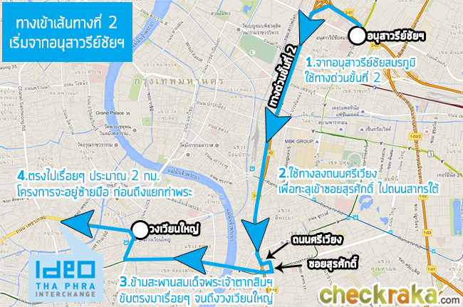 ทางเข้าโครงการเส้นทางที่ 2 - จากอนุสาวรีย์ชัยสมรภูมิ ทางออกเส้นทางที่ 1 - ไปสะพานตากสิน ทางออกเส้นทางที่ 2 - ไปอนุสาวรีย์ชัยสมรภูมิ 2. เดินทางด้วยรถไฟฟ้า