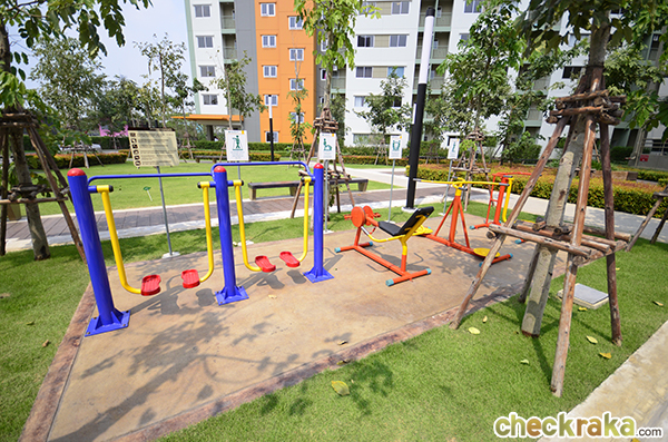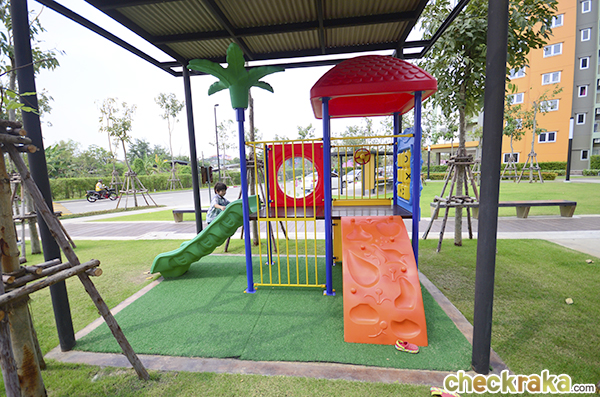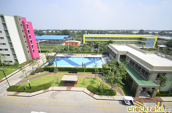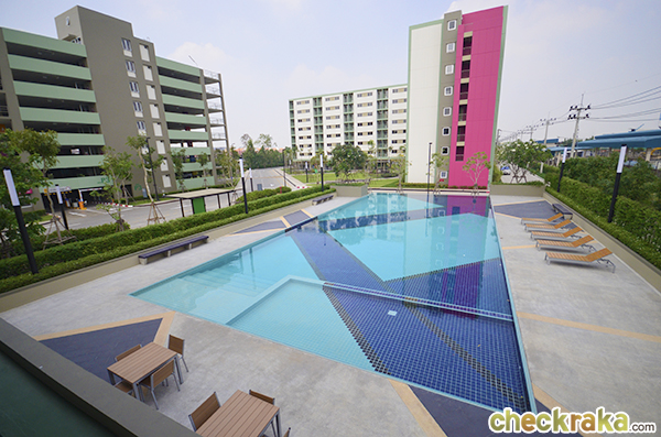 มีคอมมูนิตี้มอลล์ของโครงการอยู่ด้านหน้า เดินออกมาอีกหน่อยก็มีร้านอาหารตามสั่ง, ร้านสะดวกซื้อ, ร้านขายยา, ATM รวมถึงร้านเสริมสวย หมดห่วงเรื่องอาหารการกินไปได้เลย ไม่ไกลจากโครงการยังมีโรงพยาบาลขนาดใหญ่ (เปาโลเมโมเรียล รังสิต) และห้างสรรพสินค้าใหญ่ที่สุดในย่านนี้อย่างฟิวเจอร์พาร์ค รังสิต ที่วันหยุดว่างๆ ก็แวะมาเดินเล่นได้ค่ะ - อาคารและตัวโครงการโดยรวม - เป็นคอนโด Low-Rise สูง 8 ชั้น จำนวน 50 อาคาร ปริมาณที่จอดรถอยู่ที่ 25% (แบบรวมจอดซ้อนคัน) ส่วนกลางก็ให้มาพอสมควรค่ะ โดยจะรวมกันอยู่ที่อาคารนันทนาการ (ระหว่างอาคาร D1 และ D2) และมีอยู่ที่อาคารจอดรถ P1 มี ร้าน 7-Eleven ใต้อาคาร D1 ส่วนสวนหย่อม สนามเด็กเล่น จะแทรกตัวอยู่ตามแต่ละอาคาร แต่ว่าลูกบ้านทุกคนสามารถใช้ร่วมกันได้หมด ที่นี่มีลิฟต์โดยสารอาคารละ 2 ตัว อัตราส่วนการใช้ลิฟต์โดยเฉลี่ยอยู่ที่ประมาณ 100 ยูนิตต่อลิฟต์ 1 ตัว