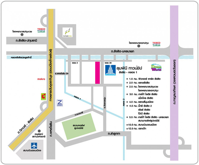 - ที่ตั้งโครงการ : ถนนรังสิต-นครนายก อำเภอธัญบุรี ตำบลประชาธิปัตย์ จังหวัดปทุมธานี 12130