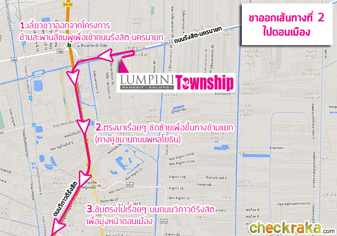 - การเดินทางเข้า-ออกโครงการ - เส้นทางหลักคือ "ถนนรังสิต-นครนายก" ซึ่งถนนสายนี้การจราจรค่อนข้างหนาแน่นทีเดียวค่ะ ทำให้การเดินทางออกจากบ้านอาจต้องเผื่อเวลานิดนึงในช่วงชั่วโมงเร่งด่วน แต่เมื่อรถไฟฟ้าสายสีแดง (บางซื่อ-รังสิต) แล้วเสร็จก็จะช่วยย่นระยะทางได้มากขึ้นค่ะ สำหรับจุดเชื่อมต่อการเดินทางหลักๆ ที่ใกล้โครงการที่สุดก็คือฟิวเจอร์พาร์ค รังสิต ซึ่งเป็นศูนย์รวมรถตู้และรถเมล์ที่สามารถนั่งมาลงหน้าโครงการได้ การเดินทางในโครงการเองก็มีรถรับ-ส่งภายใน อัตราค่าบริการ 5 บาทตลอดสาย