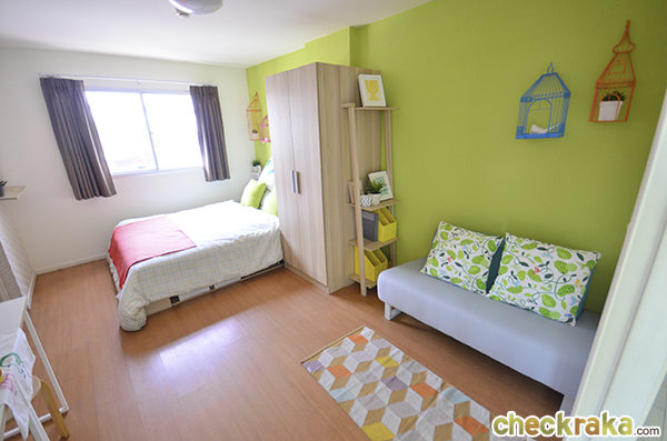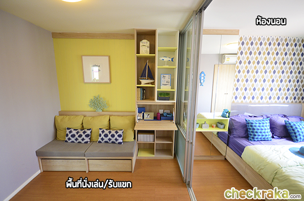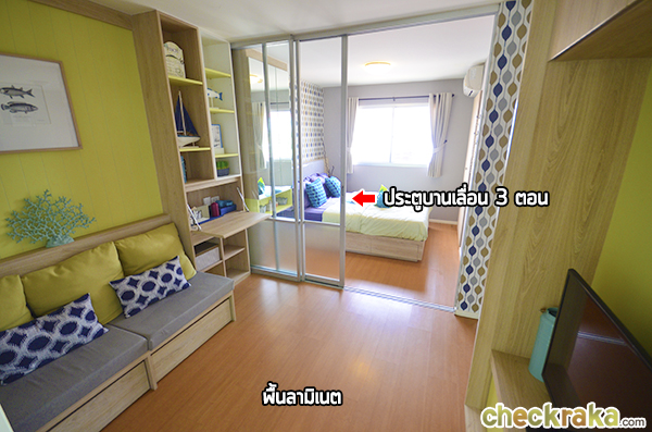 เข้ามาในห้องจะเจอพื้นที่นั่งเล่นและรับแขก ตรงเข้าไปก็จะเป็นห้องนอนกั้นด้วยประตูบานเลื่อน 3 ตอน