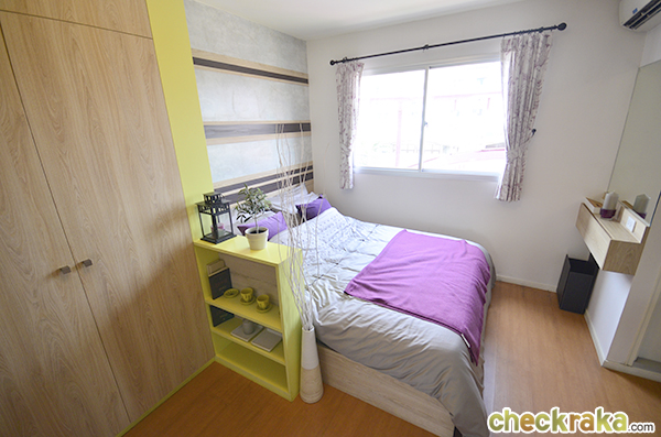 ถัดไปจะเป็นโซนห้องนอนค่ะ โดยเฟอร์นิเจอร์แบบนี้จะมีตู้เสื้อผ้า และชั้นเล็กๆ กั้นเตียงให้ พร้อมหน้าต่างรับแสงบานใหญ่