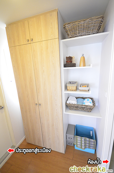 เข้ามาสุดห้องจะเจอตู้เสื้อผ้าบิวท์อิน และชั้นวางของ ซ้ายมือออกไประเบียง ส่วนขวามือเป็นห้องน้ำห้องที่ 2 ค่ะ