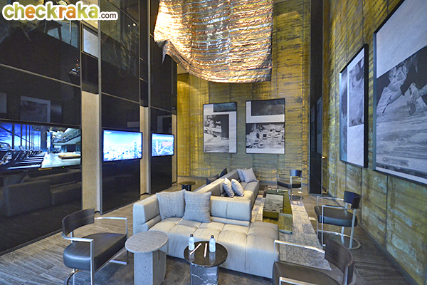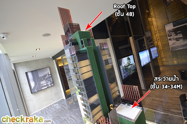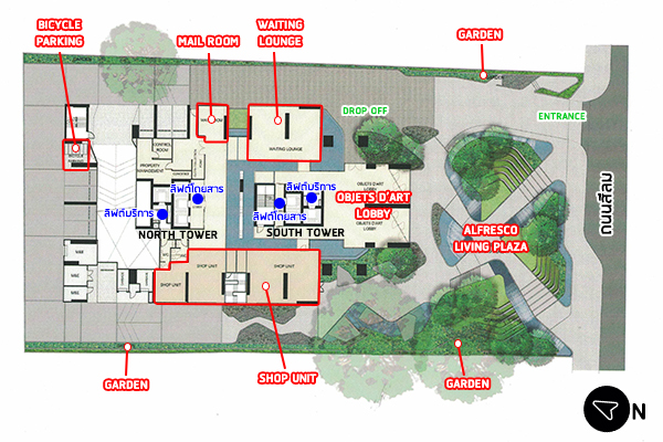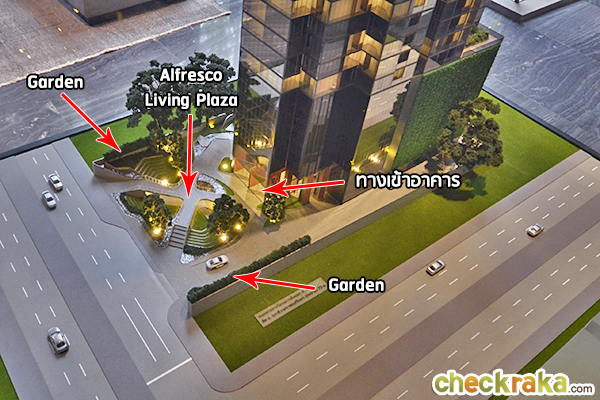 Alfresco Living Plaza ถูกออกแบบให้เป็นพื้นที่สีเขียวหน้าโครงการ มีสะพานยกระดับเป็นลูกเล่นเดินข้ามไปหน้าทางเข้าอาคาร ลานจอดรถจะอยู่ที่ชั้น 1-9 สำหรับชั้น 1 มีจุดจอดรถ Super Car ด้วยค่ะ ระหว่างตึกทั้งสองจะมีระยะห่างประมาณ 3 เมตร ซึ่งช่องว่างตรงนี้จะเป็นที่แขวนคอมเพรสเซอร์แอร์ค่ะ ทุกห้องคอมเพรสเซอร์แอร์จะมารวมอยู่ตรงนี้ Facilities จะอยู่บนชั้น 34-34M และชั้น 48 ค่ะ แท่งสีแดงที่อยู่ด้านบนสุดของตึกเปรียบเสมือนยอดสูง เป็นสัญลักษณ์โดดเด่นแบบหอไอเฟล บรรยากาศภายใน Sales Gallery ที่ถูกออกแบบมาเหมือนกับโถง Lobby ค่ะ