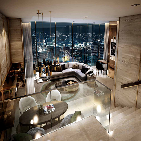 ปูด้วยกระเบื้องพอร์ซเลนอิตาเลียน ( Italian porcelain ) ห้องรับแขกจะมีกระจกบานเลื่อนเข้ามุม ที่สามารถเลื่อนเปิด-ปิด รับอากาศจากภายนอกได้