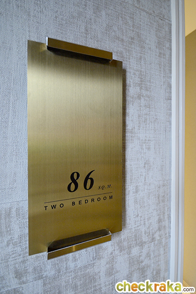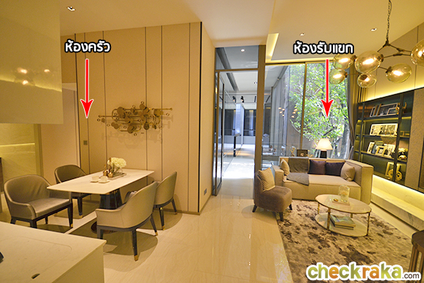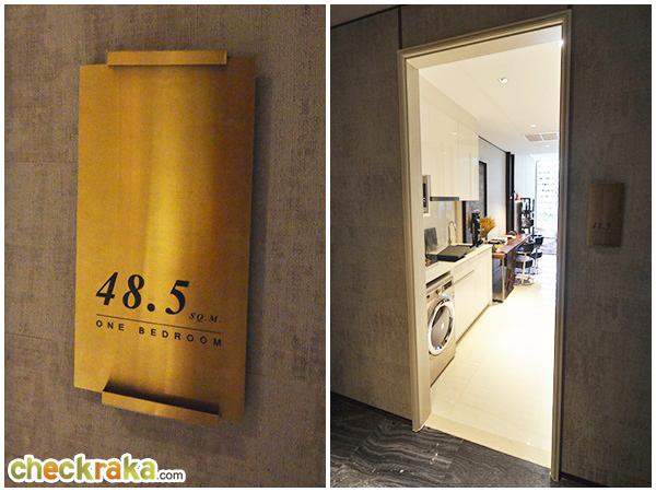 ประตูห้องจริงจะเป็น Digital Door Lock จาก Yale เช่นเดียวกับห้องแบบ 1 ห้องนอนค่ะ เดินเข้ามาจะเจอห้องครัวด้านซ้ายมือ และห้องรับแขกด้านขวามือค่ะ ประตูกระจกด้านหลังเปิดทะลุไประเบียงได้