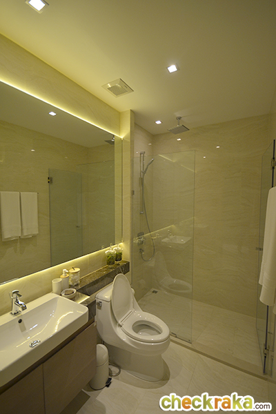 สุขภัณฑ์จาก Kohler และ Grohe มีฉากกั้นอาบน้ำและจัดเต็มด้วยกระจกบานใหญ่ เดินออกจากห้องน้ำ ขวามือจะเป็นห้องนอนเล็กซึ่งจะตกแต่งเป็นห้องนอนหรือห้องทำงานก็ได้