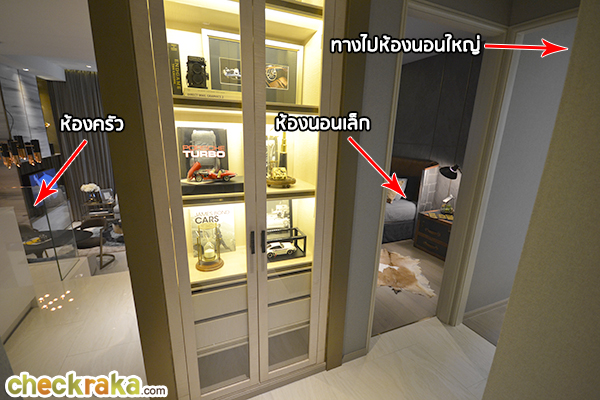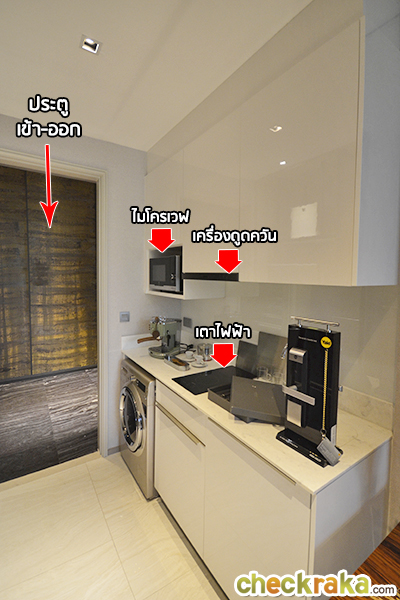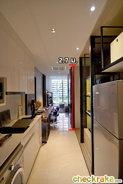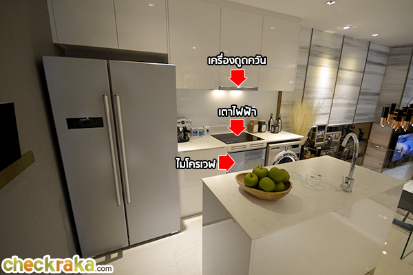 มีเครื่องดูดควัน Smeg และพิเศษสำหรับห้อง 2 Bedroom จะมีเตาไฟฟ้ากับไมโครเวฟ Built-in มาให้ด้วย ทางเชื่อมไปห้องน้ำ, ห้องนอนเล็ก และห้องนอนใหญ่ ความสูงจากพื้นถึงเพดาน