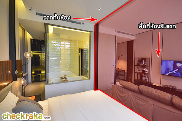 เลือกเป็นทีวีติดผนังก็จะช่วยประหยัดพื้นที่ได้อีก ส่วนแอร์เป็นแบบฝังฝ้า แอบมองเห็น Sexy Bath ด้วย