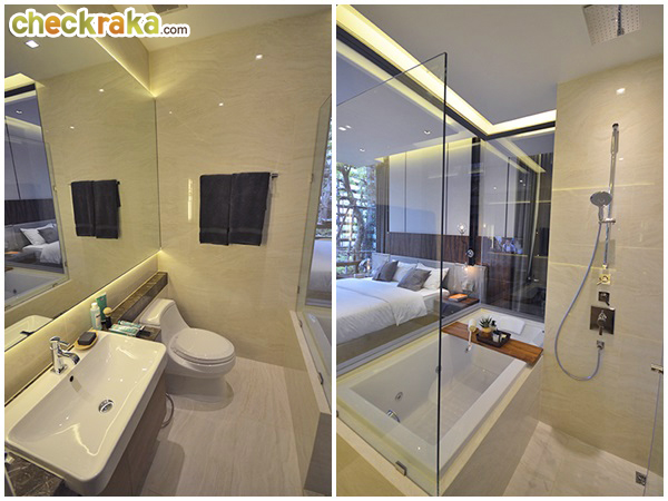 สุขภัณฑ์จาก Kohler และ Grohe มีจากุซซี่ พร้อมกระจกสูงจรดเพดานให้ชมวิวเบาๆ ถัดมาจะเป็นห้องนอนใหญ่ค่ะ ห้องนี้โดดเด่นด้วยกระจกสูงจรดเพดานเช่นกัน