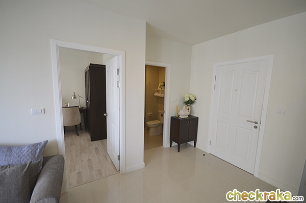 เปิดประตูเข้ามาจะเจอโซนรับแขกค่ะ ซ้ายมือจะเป็นครัว ส่วนทางขวามือจะเป็นห้องน้ำและห้องนอนห้องที่ 2