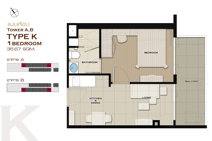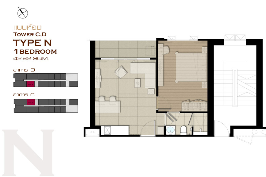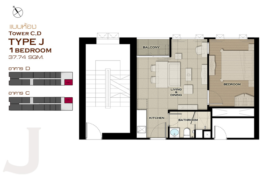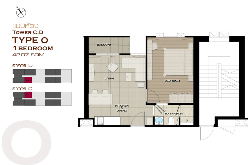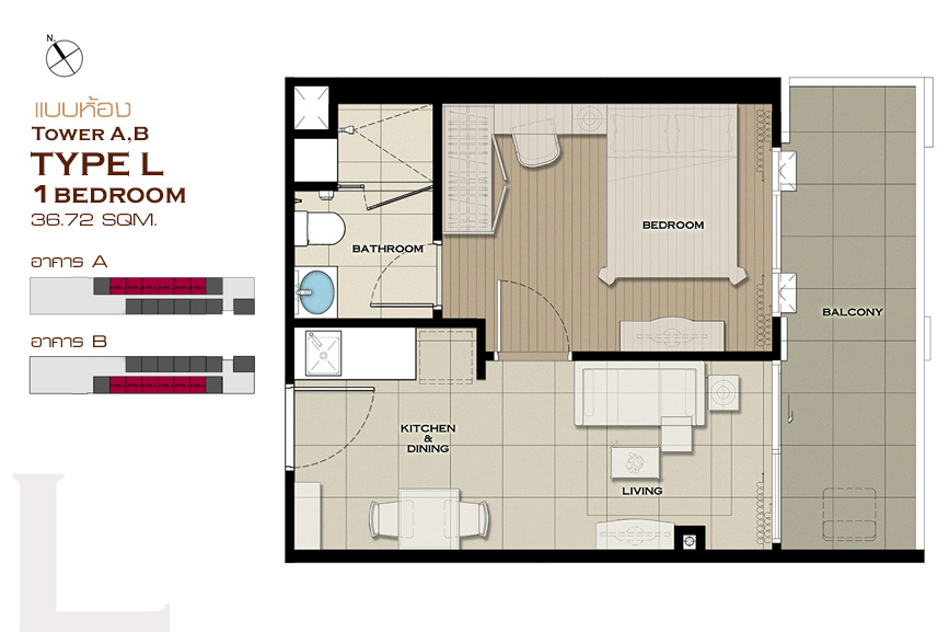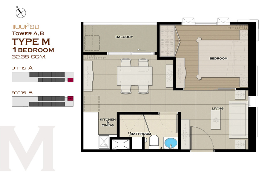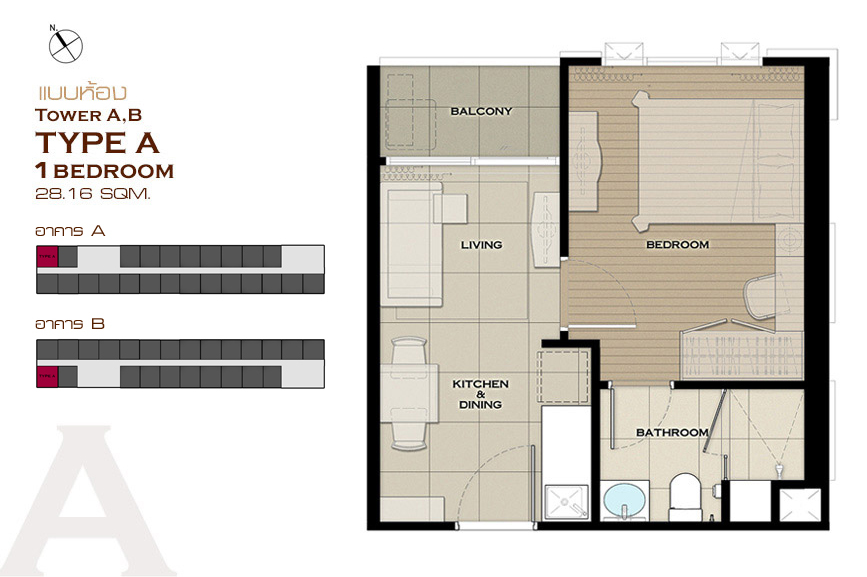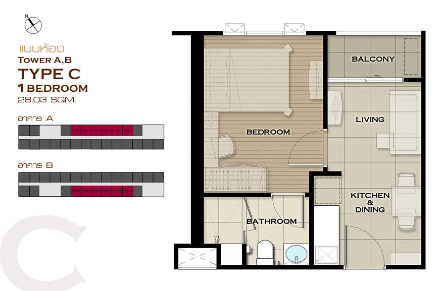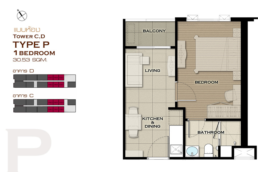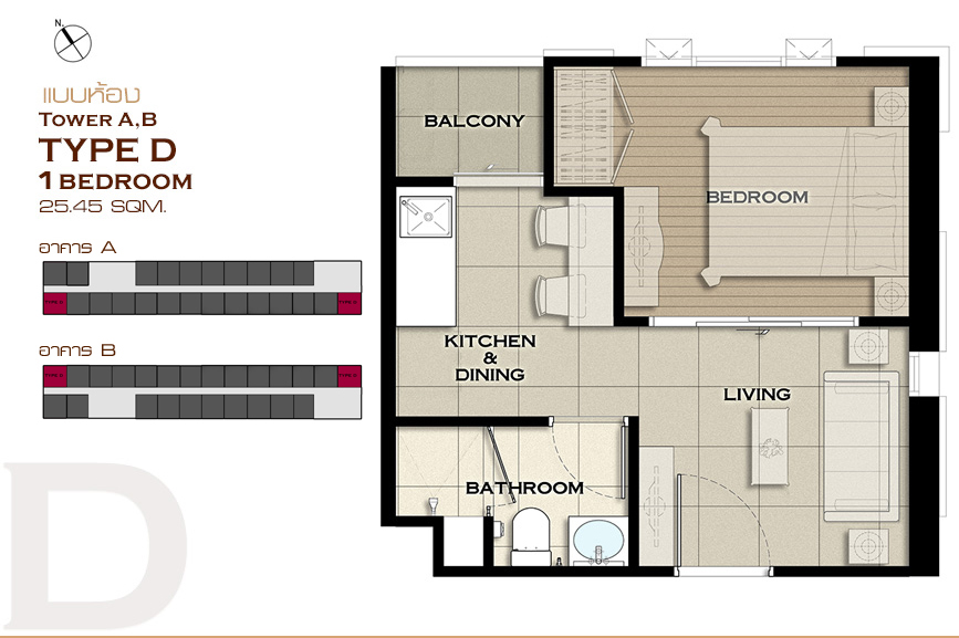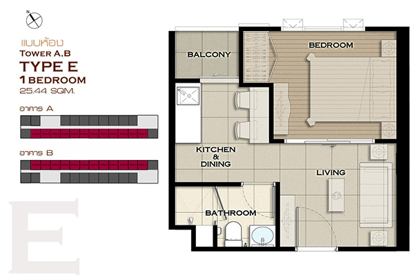 1 ห้องนอน Type A , Type B , Type C , Type D , Type E , Type J , Type K , Type L , Type M , Type N , Type O และ Type P 2 ห้องนอน Type F , Type G , Type H และ Type I แบบห้อง 1 ห้องนอน ขนาด 25.44 ตร.ม.