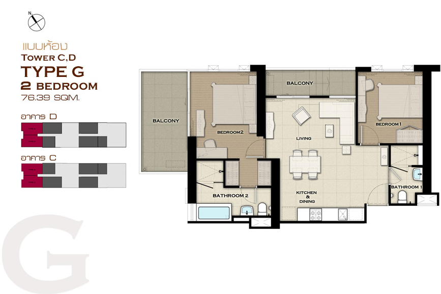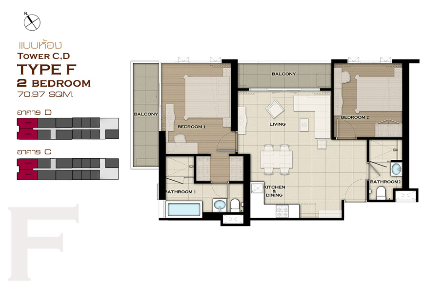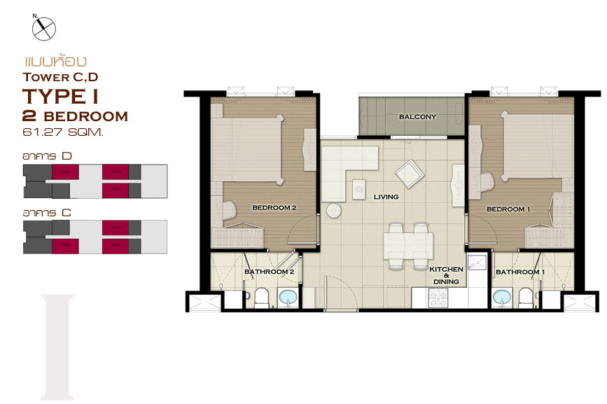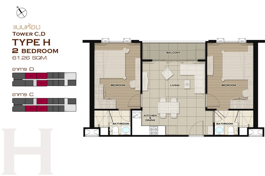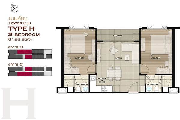แบบห้อง 2 ห้องนอน ขนาด 61.26 ตร.ม.