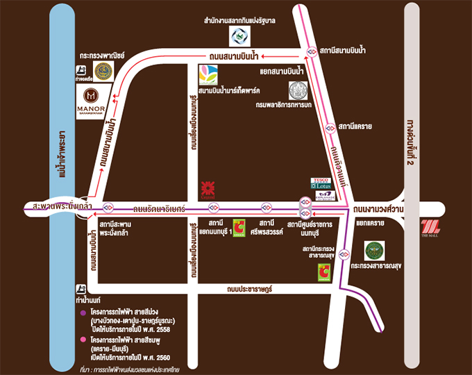 ตัวโครงการอยู่ไม่ไกลจากสถานีรถไฟฟ้าส่วนต่อขยาย 2 เส้นทางด้วยกัน คือ สายสีม่วง และสายสีชมพู สำหรับรถไฟฟ้าสายสีม่วงนั้น ปัจจุบันก่อสร้างเสร็จแล้ว และจะเปิดให้บริการภายในปี 2559 นี้อย่างแน่นอน ส่วนสายสีชมพูอาจจะต้องรอกันอีกนิดนะคะ คาดว่าจะเริ่มก่อสร้างภายในปี 2560 นี้ค่ะ