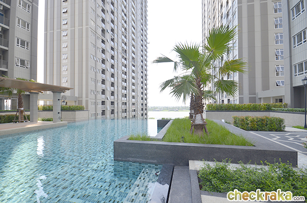 มองลงไปที่ชั้น 1 จะเจอสวน สระว่ายน้ำ และแม่น้ำ