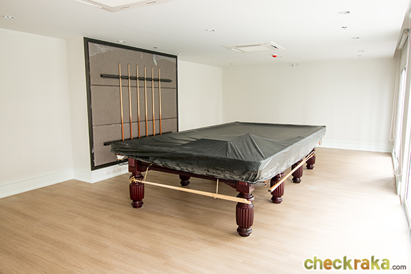 ห้องสนุกเกอร์ ในห้องฟิตเนสมีเครื่องออกกำลังกายจัดเต็มมากค่ะ อุปกรณ์บอดี้เวทก็มีด้วย ส่วนกลางที่ริมแม่น้ำ