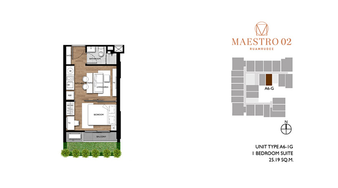 แบบ 1 ห้องนอน สวีท (พื้นที่ใช้สอย 25.5-37.0 ตร.ม.) A6-1G : พื้นที่ใช้สอย 25.19 ตร.ม. (