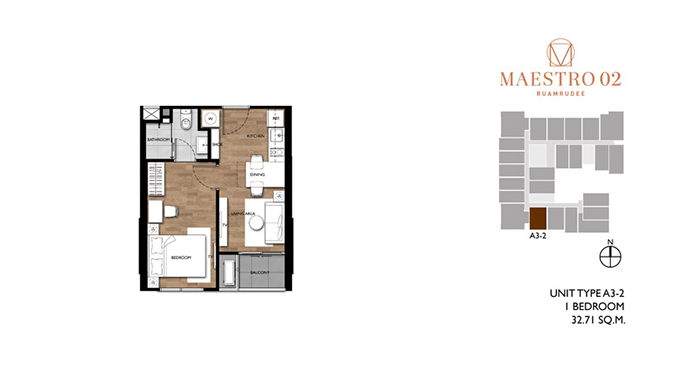 A3-2 : พื้นที่ใช้สอย 32.71 ตร.ม. (คลิกเพื่อชมตัวอย่างแปลน)
