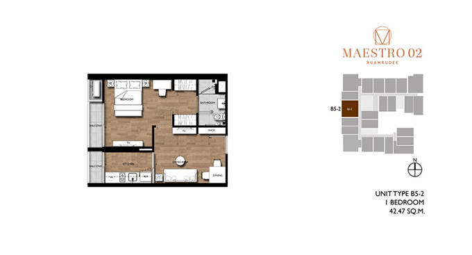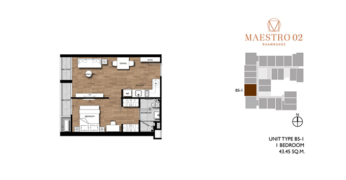 B5-1 : พื้นที่ใช้สอย 43.45 ตร.ม. (คลิกเพื่อชมตัวอย่างแปลน)