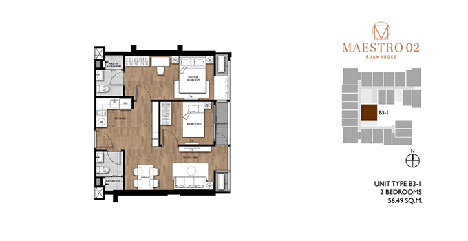 B3-1 : พื้นที่ใช้สอย 56.49 ตร.ม. (คลิกเพื่อชมตัวอย่างแปลน)