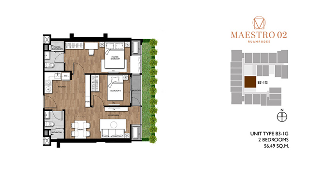 B3-1G : พื้นที่ใช้สอย 56.49 ตร.ม. (คลิกเพื่อชมตัวอย่างแปลน)