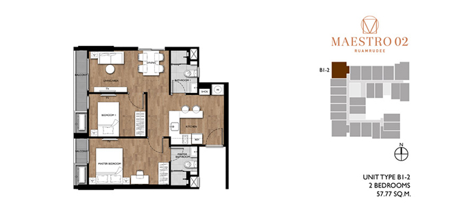 B1-2 : พื้นที่ใช้สอย 57.77 ตร.ม. (คลิกเพื่อชมตัวอย่างแปลน)