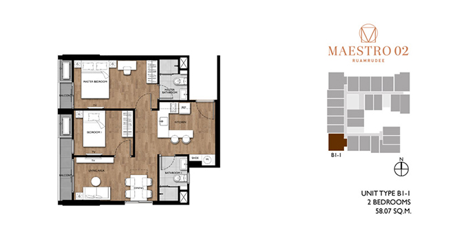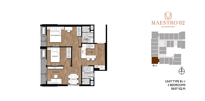 ตัวอย่าง ห้องแบบ 2 ห้องนอน 2 ห้องน้ำ - พื้นที่ใช้สอย 58.07 ตร.ม.