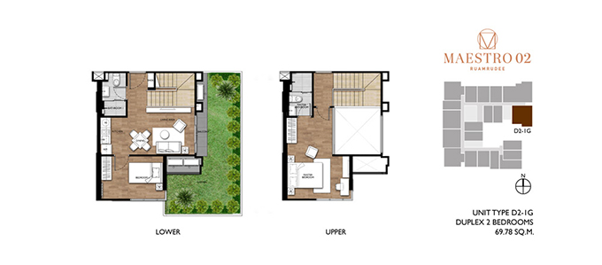 แบบ 2 ห้องนอน ดูเพล็กซ์ (พื้นที่ใช้สอย 69.5 ตร.ม.)D2-1G : พื้นที่ใช้สอย 69.78 ตร.ม. (