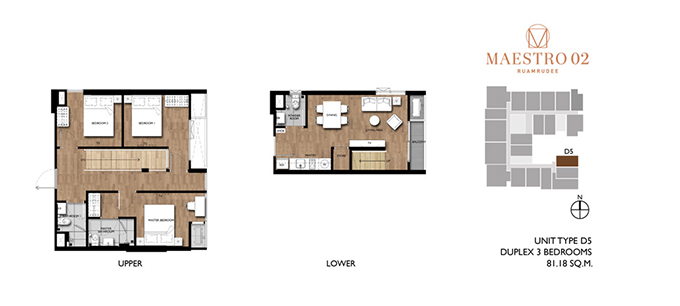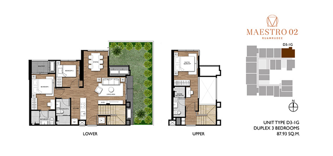 แบบ 3 ห้องนอน ดูเพล็กซ์ (พื้นที่ใช้สอย 77.0-87.0 ตร.ม.)D3-1G : พื้นที่ใช้สอย 87.93 ตร.ม. (