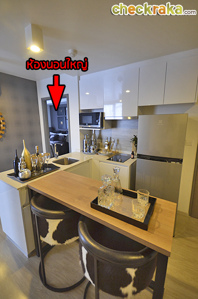 ห้องครัว Type นี้จะมีเคาน์เตอร์ยาวเก๋ๆ ไว้ให้ด้วยค่ะ ซึ่งโครงการจัดให้พร้อมกับเก้าอี้ ยกเว้นเครื่องใช้ไฟฟ้าเท่านั้นค่ะ