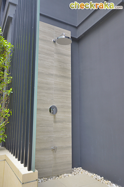 ส่วนเปียกเป็นกระเบื้องสีเทา เจาะช่องสำหรับวางอุปกรณ์อาบน้ำ 2 ช่องพอดีๆ