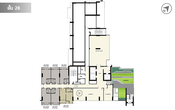 มีห้องพักอาศัยทั้งหมด 22 ยูนิต และมีสวนหย่อมเล็กๆ อยู่ทางทิศตะวันออกด้วยค่ะ ชั้น 26 มีห้องพักอาศัยทั้งหมด 22 ยูนิต ชั้น 27 มีห้องพักอาศัยทั้งหมด 22 ยูนิต ชั้น 28 เป็นชั้นที่มีห้องพักอาศัย 6 ยูนิต มีห้องสมุด และห้อง Social Club