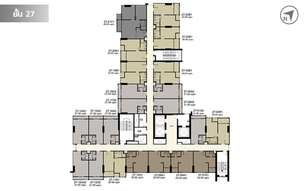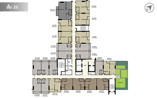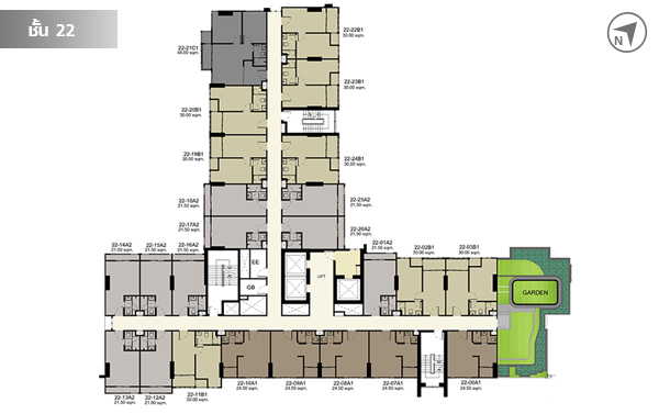 ชั้น 22 มีห้องพักอาศัยทั้งหมด 24 ยูนิต มีสวนหย่อมเล็กๆ อยู่ทางทิศตะวันออกด้วยค่ะ ชั้น 23 - 24 แต่ละชั้นมีห้องพักอาศัยชั้นละ 24 ชั้น รวม 48 ชั้น