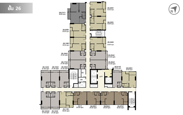 ชั้น 7 - 21 แต่ละชั้นมีห้องพักอาศัยชั้นละ 26 ยูนิต รวม 364 ยูนิต