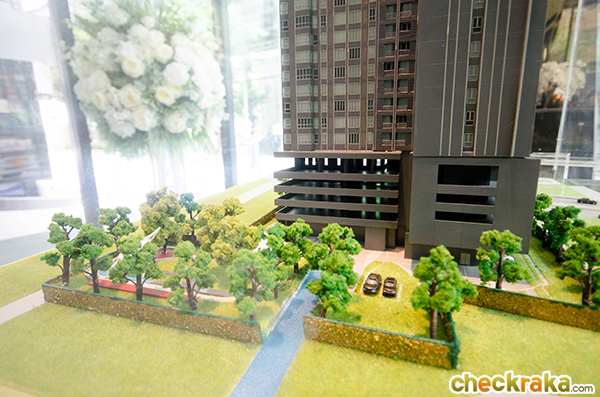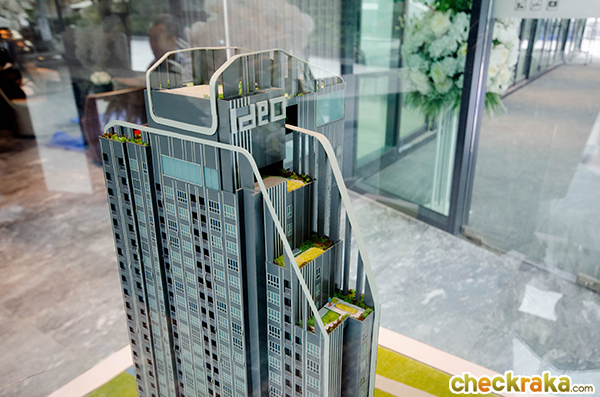 มองจากด้านบนโมเดลโครงการจะเห็นสวนหย่อมชั้น Sky Garden และสระว่ายน้ำ