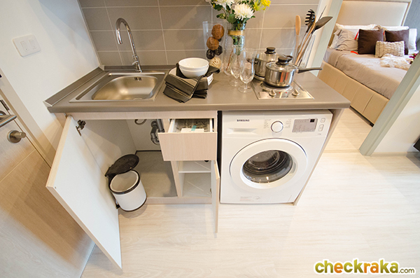 เคาน์เตอร์ครัวด้านล่าง มีช่องเก็บของ 3 ช่อง และมีพื้นที่ไว้สำหรับวางเครื่องซักผ้าตามภาพเลยค่ะ
