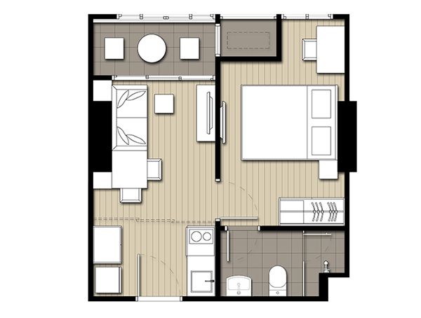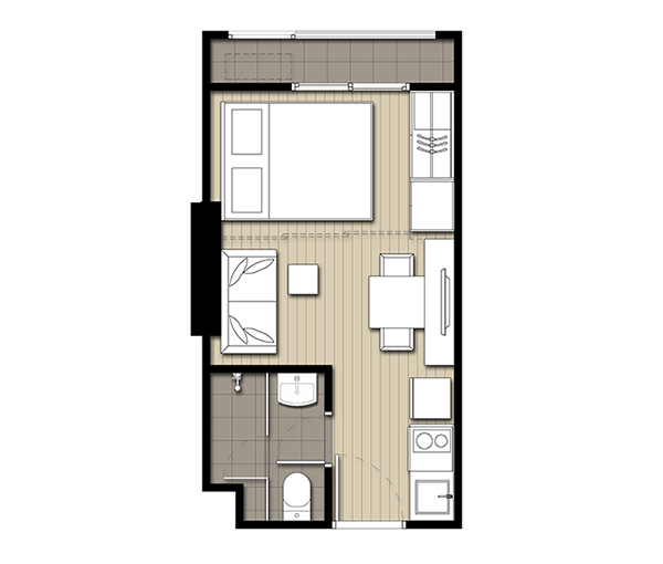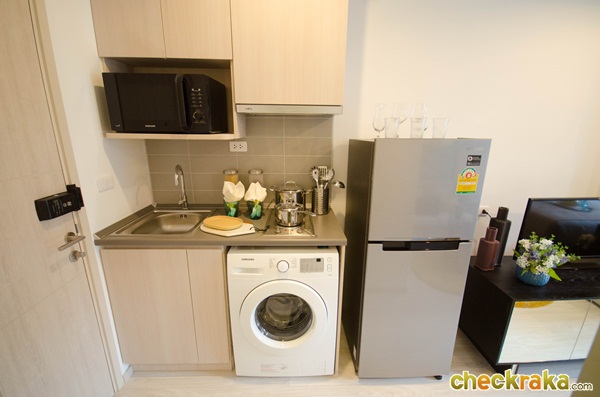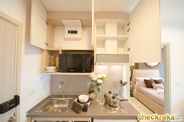 เปิดประตูเข้ามาจะเห็นห้องน้ำอยู่ขวามือ เคาน์เตอร์ครัวอยู่ด้านซ้ายมือ ตรงเข้าไปจะเป็นพื้นที่นั่งเล่นและเตียงนอน