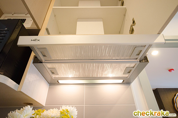 เครื่องดูดควัน และปูกระเบื้องกันเปื้อนที่ผนังห้องให้ด้วย พื้นที่ด้านข้างเคาน์เตอร์ครัวสามารถวางตู้เย็นได้สบายเลยค่ะ