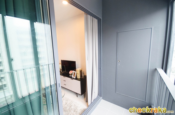 ริมระเบียง พื้นเป็นกระเบื้องมีธรณีกั้นกันน้ำเข้า พื้นที่กว้างพอสำหรับวางโต๊ะนั่งเล่นเล็กๆ ได้เลยค่ะ